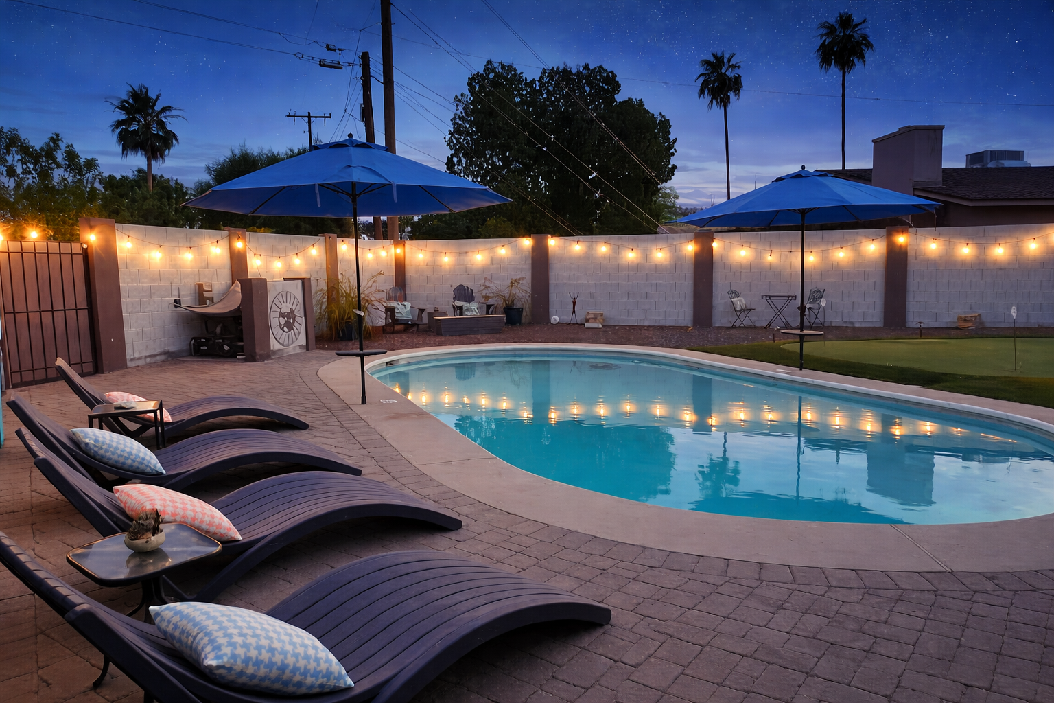 OLD TOWN SCOTTSDALE BUNGALOW Your private, amenity-rich escape in the heart of Scottsdale. We offer a locally managed experience tailored for discerning professionals who expect quality, comfort, and thoughtful design. Great for small groups, couple’s getaway and multi-generational families looking to relax in a private resort style home. No Parties or Events. THE SPACE • 3 bedrooms • 3 baths • Sleeps 6 • 4 Smart TV's • Fast WiFi and dedicated workspace • Fully Stocked Kitchen and Generous Pantry • Salt-water Pool • 3-hole Putting Green • Outdoor BBQ and Dining Table • 2 Minutes to Old Town Scottsdale • Camelback Mountain Views from the courtyard • Luxury touches and hospitality throughout your stay • EV Charger. Please inquire about EV usage, prior to booking. (Tesla users bring a J1772 adapter). LIVING SPACE Leather sectional by the 65" LED Smart TV and opens to a view of the pool and resort like backyard. KITCHEN • Filtered Water • Single Cup + Drip Coffee Machine w/creamer and sweeteners • Fully stocked kitchen • Storage containers, mixing bowls, dish towels, sharp knives • Pots, pans and baking dishes, spices • 12' Kitchen Island with seating for 4 LAUNDRY • Full size modern washer and dryer • Laundry soap • Clothes steamer BEDROOMS • Bedroom 1: King Bed, 54” TV • Bedroom 2: Queen Bed, 54” TV • Bedroom 3: Queen Bed + workspace • Sleeping Option 4: Queen Sealy blow-up mattress BATHROOMS • Primary Ensuite with walk-in shower; toiletries • Main Bath with Tub/Shower combo; toiletries • Pool Bath with walk-in shower; toiletries OUTDOOR • Conversational lounging area w/ 65” TV • Courtyard fire-pit and Camelback view • Day Bed for lounging • Pool Bath (3rd Bathroom) • 3-hole Putting Green • Cornhole and games • Weber BBQ • Dining Table • Pool Loungers • Pool Towels • Stainless Steel Cooler PARKING • Off-street parking for 2 Vehicles. • Garage is not accessible to guests. Please inquire about golf club storage. CONCIERGE SERVICES • Private Cart Tour experiences available, but are not included in your stay. EARLY CHECK-IN • May be accommodated for a minimal fee (if available). LATE CHECK-OUT • Generally unavailable; but may be accommodated for a minimal fee (if available). UNAUTHORIZED LATE DEPARTURES (After 11:00AM) • Will be subject to fees and is strictly enforced to support both our guests and our team. SUSTAINABILITY IN ACTION • Desert scape & turf • Refillable toiletries • LED lighting throughout • Energy-efficient appliances and smart thermostat • Digital guidebook • Electric low-speed vehicle. private cart tours available, but not included in stay GUEST ACCESS The garage is not accessible to guests. Please inquire about golf club storage. OTHER THINGS TO NOTE Helpful digital guidebook provided upon booking. While the pool isn't heated, and desert nights can be quite chilly, it is always available to take the plunge.